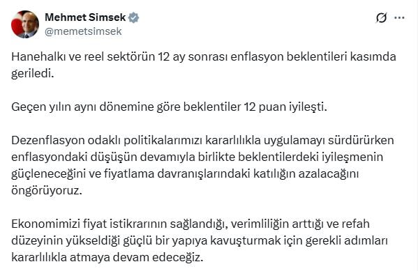 Bakan Mehmet Şimşek, sektörel enflasyon beklentilerine ilişkin sosyal medya hesabından açıklama yaptı. Bakan Şimşek, "Hanehalkı ve reel sektörün 12 ay sonrası enflasyon beklentileri kasımda geriledi. Geçen yılın aynı dönemine göre beklentiler 12 puan iyileşti. Dezenflasyon odaklı politikalarımızı kararlılıkla uygulamayı sürdürürken enflasyondaki düşüşün devamıyla birlikte beklentilerdeki iyileşmenin güçleneceğini ve fiyatlama davranışlarındaki katılığın azalacağını öngörüyoruz. Ekonomimizi fiyat istikrarının sağlandığı, verimliliğin arttığı ve refah düzeyinin yükseldiği güçlü bir yapıya kavuşturmak için gerekli adımları kararlılıkla atmaya devam edeceğiz" ifadelerini kulandı. (DHA)