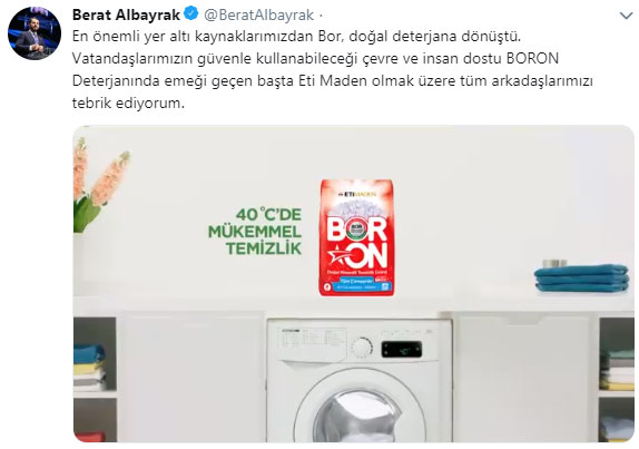 Bakan Albayrak, "En önemli yer altı kaynaklarımızdan Bor, doğal deterjana dönüştü. Vatandaşlarımızın güvenle kullanabileceği çevre ve insan dostu BORON Deterjanında emeği geçen başta Eti Maden olmak üzere tüm arkadaşlarımızı tebrik ediyorum" dedi.