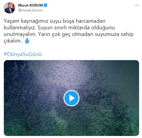 Çevre ve Şehircilik Bakanı Murat Kurum, Dünya Su Günü dolayısıyla Twitter hesabından, "Yaşam kaynağımız suyu boşa harcamadan kullanmalıyız. Suyun sınırlı miktarda olduğunu unutmayalım. Yarın çok geç olmadan suyumuza sahip çıkalım" mesajını paylaştı.