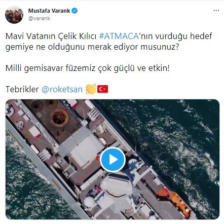 Bakan Varank sosyal medyada yaptığı paylaşımda, "Mavi Vatanın Çelik Kılıcı ATMACA'nın vurduğu hedef gemiye ne olduğunu merak ediyor musunuz? Milli gemisavar füzemiz çok güçlü ve etkin! Tebrikler Roketsan" ifadelerini kullandı.