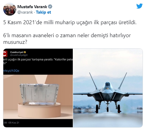 Varak, mesajında, "5 Kasım 2021'de milli muharip uçağın ilk parçası üretildi. 6'lı masanın avaneleri o zaman neler demişti hatırlıyor musunuz" açıklamasında bulundu.