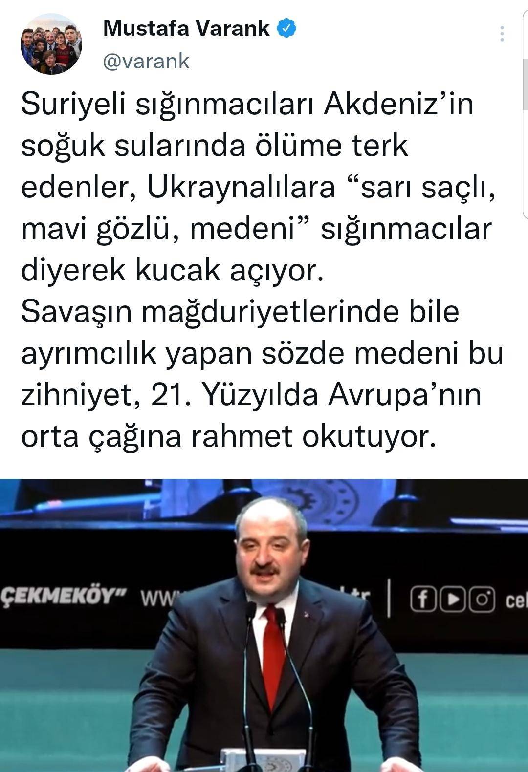 Suriyeli sığınmacıları Akdeniz’in soğuk sularında ölüme terk edenlere tepki gösteren Bakan Varank; "Ukraynalılara 'sarı saçlı, mavi gözlü, medeni' sığınmacılar diyerek kucak açıyor. Savaşın mağduriyetlerinde bile ayrımcılık yapan sözde medeni bu zihniyet, 21. Yüzyılda Avrupa’nın orta çağına rahmet okutuyor." dedi.