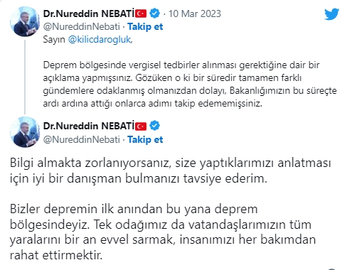 "Sayın Kemal Kılıçdaroğlu, Deprem bölgesinde vergisel tedbirler alınması gerektiğine dair bir açıklama yapmışsınız. Gözüken o ki bir süredir tamamen farklı gündemlere odaklanmış olmanızdan dolayı, Bakanlığımızın bu süreçte ardı ardına attığı onlarca adımı takip edememişsiniz.