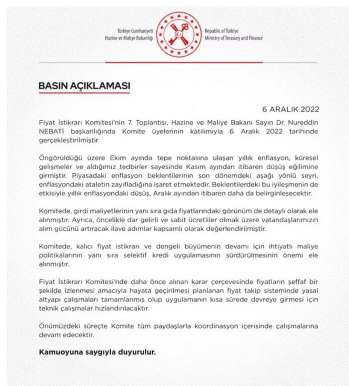 Bakan Nebati sosyal medyadan yaptığı açıklamada, "Fiyat İstikrarı Komitesi’nin yedinci toplantısını gerçekleştirdik. Komite’de daha önce değerlendirdiğimiz üzere Kasım ayında tepe noktasından gerileyen yıllık enflasyonun, beklentilerdeki iyileşme ile birlikte önümüzdeki dönemde daha da gerileyeceğini öngörüyoruz. Ayrıca, ihtiyatlı maliye politikalarının yanı sıra selektif kredi uygulamalarının sürdürülmesinin önemini vurguladık." ifadelerini kullandı.