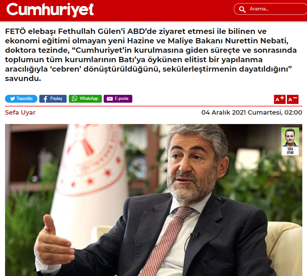 Hazine ve Maliye Bakanı Nureddin Nebati, "AK Parti Teşkilatlarının Demokratik Değerlere Bakışı Üzerine Karşılaştırmalı Bir Analiz: Milli Görüş’ten Muhafazakâr Demokrasiye" adlı doktora tezinde, Cumhuriyet'in kurulmasının ardından İslam’ın gericilikle özdeşleştirildiğini söyleyerek, Kemalizmin ithal edildiğine dikkat çekmişti.