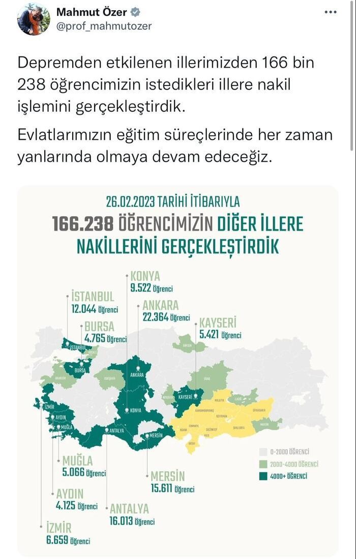 Bakan Özer, Twitter'daki hesabından yaptığı açıklamada, "Depremden etkilenen illerimizden 166 bin 238 öğrencimizin istedikleri illere nakil işlemini gerçekleştirdik. Evlatlarımızın eğitim süreçlerinde her zaman yanlarında olmaya devam edeceğiz" dedi.