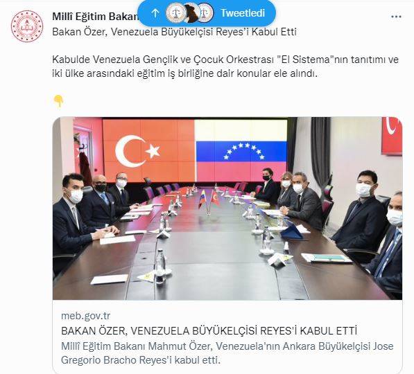 Bakanlığın sosyal medya hesabından yapılan paylaşımda, “1975 yılında kurulan El Sistema'nın son olarak Cumhurbaşkanı Recep Tayyip Erdoğan'ın 2018 yılında ülkeye yaptığı ziyaretinde güzel bir konser verdiğini belirten Bakan Özer, Venezuela ile ikili ilişkilere büyük önem verildiğini ve ülkenin Türkiye'nin Latin Amerika'daki önemli ortaklarından biri olarak görüldüğünü ifade etti. Özer, Venezuela ile eğitim ve kültür alanlarında iş birliğini güçlendirmek istediklerini belirtti. Kendisini kabulünden duyduğu memnuniyeti dile getiren Reyes de Bakan Özer'e teşekkür etti.” ifadelerine yer aldı.