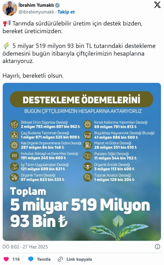 Yumaklı, sosyal medya hesabından yaptığı paylaşımda, destekleme ödemelerine ilişkin bilgi verdi.
