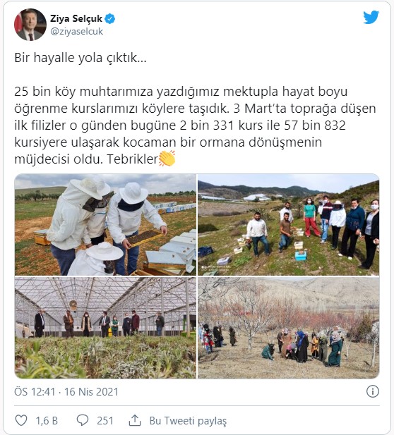 Paylaşımında “Bir hayalle yola çıktık…” diyen Bakan Selçuk, “25 bin köy muhtarımıza yazdığımız mektupla hayat boyu öğrenme kurslarımızı köylere taşıdık. 3 Mart’ta toprağa düşen ilk filizler o günden bugüne 2 bin 331 kurs ile 57 bin 832 kursiyere ulaşarak kocaman bir ormana dönüşmenin müjdecisi oldu. Tebrikler.” ifadelerini kullandı.