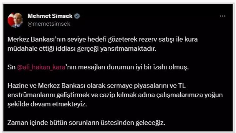 Bakan Şimşek, "Merkez Bankası’nın seviye hedefi gözeterek rezerv satışı ile kura müdahale ettiği iddiası gerçeği yansıtmamaktadır" açıklamasını yaptı.