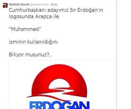 Maliye Bakanı Mehmet Şimşek, AK Parti'nin Köşk adayı Başbakan Recep Tayyip Erdoğan için Cumhurbaşkanlığı seçimlerine özel olarak hazırlanan ve "tünelin ucundaki ışık" manasına geldiği söylenen 'Erdoğan Logosu'na ilişkin, Arapça olarak "Muhammed" isminin kullanıldığını twitter hesabından kullanıcılarıyla paylaştı.