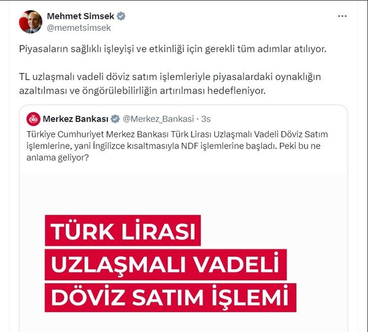 TCMB, döviz piyasasının sağlıklı çalışması, kurlarda oynaklıkların engellenmesi ve döviz likiditesinin dengelenmesi amacıyla TL uzlaşmalı vadeli döviz satım işlemlerine başladı. Hazine ve Maliye Bakanı Mehmet Şimşek, TCMB'nin konuyla ilgili sosyal medya paylaşımını alıntılayarak, "Piyasaların sağlıklı işleyişi ve etkinliği için gerekli tüm adımlar atılıyor. TL uzlaşmalı vadeli döviz satım işlemleriyle piyasalardaki oynaklığın azaltılması ve öngörülebilirliğin artırılması hedefleniyor" ifadelerini kullandı.