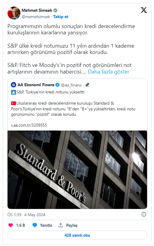 Programımızın olumlu sonuçları kredi derecelendirme kuruluşlarının kararlarına yansıyor. S&P ülke kredi notumuzu 11 yılın ardından 1 kademe artırırken görünümü pozitif olarak korudu. S&P, Fitch ve Moody’s’in pozitif not görünümleri not artışlarının devamının habercisi. Güçlendirerek uygulamaya devam ettiğimiz programımızla ülkemize duyulan güveni en üst seviyeye taşımakta kararlıyız.