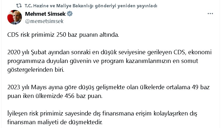 Bakan Şimşek, sosyal medya hesabından yaptığı açıklamada, "CDS risk primimiz 250 baz puanın altında. 2020 yılı Şubat ayından sonraki en düşük seviyesine gerileyen CDS, ekonomi programımıza duyulan güvenin ve program kazanımlarımızın en somut göstergelerinden biri.