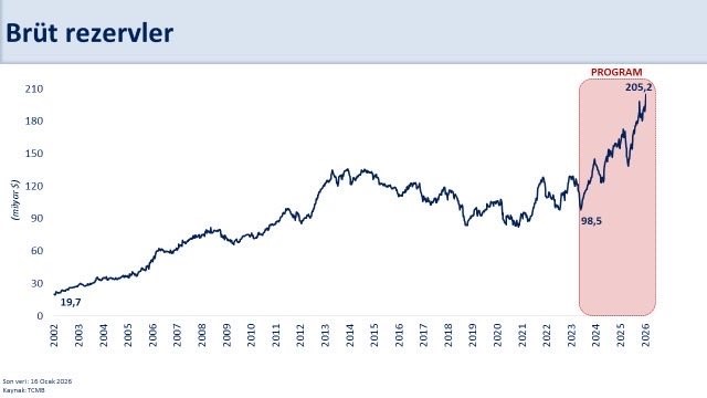 "Rezervlerimiz tarihi zirvesinde. Uyguladığımız program sayesinde brüt rezervler yaklaşık 107 milyar dolar artarak 205,2 milyar dolara ulaştı. Swap hariç net rezervlerdeki artış ise 139,3 milyar dolar oldu. Uluslararası standartlara göre rezerv yeterliliğini sağladık. Aynı zamanda, önemli bir şartlı yükümlülük olan 143 milyar dolar tutarındaki KKM'den çıkış sürecini de başarıyla tamamlıyoruz. Böylece döviz pozisyonunda toplam 280 milyar doları aşan iyileşme gerçekleşti. Güçlenen makro finansal istikrar, risk primimizin azalmasına ve ekonomimizin şoklara karşı daha dayanıklı hale gelmesine önemli katkı sağlıyor."