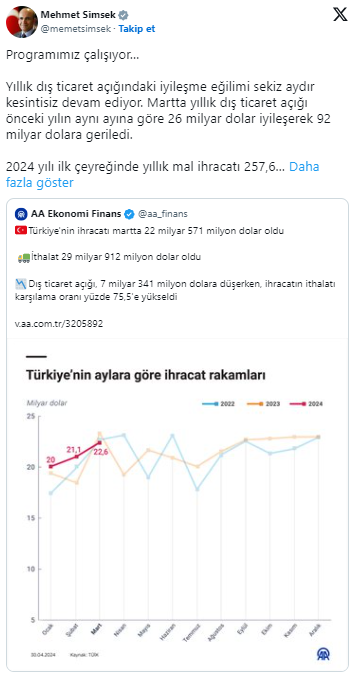 Şimşek, sosyal medya hesabından, Türkiye İstatistik Kurumunun açıkladığı mart ayı dış ticaret verilerine ilişkin paylaşım yaptı.