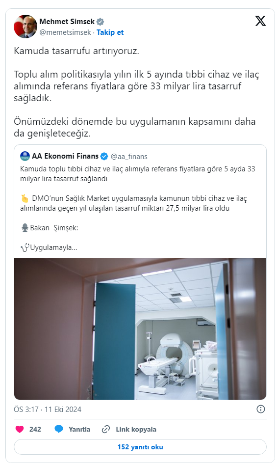 Hazine ve Maliye Bakanı Mehmet Şimşek, kamuya yönelik tasarruf tedbirlerine ilişkin X hesabı üzerinden önemli açıklamalarda bulundu. Şimşek, kamu harcamalarını azaltmak için toplu alım politikasını başarıyla uyguladıklarını belirtti.