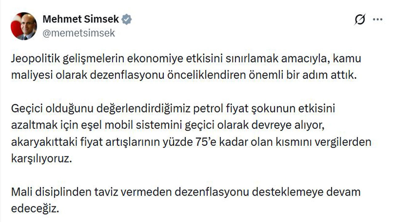 Hazine ve Maliye Bakanı Mehmet Şimşek, ABD ve İsrail’in İran’a saldırıları sonrası yaşanan petrol fiyat şokunun etkisini azaltmak için eşel mobil sistemini geçici olarak devreye aldıklarını açıklayarak “Akaryakıttaki fiyat artışlarının yüzde 75'e kadar olan kısmını vergilerden karşılıyoruz" dedi.