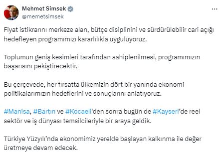 Bakan Şimşek, X üzerinden yaptığı açklamada, "Toplumun geniş kesimleri tarafından sahiplenilmesi, programımızın başarısını pekiştirecektir." ifadesini kullandı.