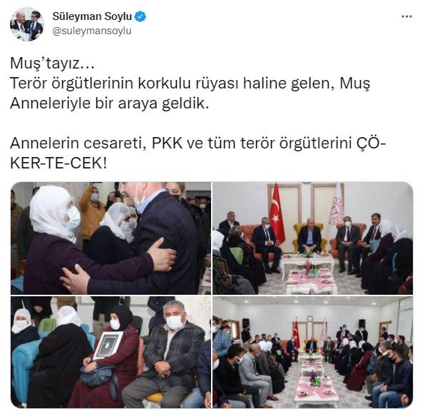 Ziyarete ilişkin sosyal medya hesabından paylaşım yapan Soylu, “Muş’tayız... Terör örgütlerinin korkulu rüyası haline gelen, Muş Anneleriyle bir araya geldik. Annelerin cesareti, PKK ve tüm terör örgütlerini ÇÖ-KER-TE-CEK!” ifadelerini kullandı.