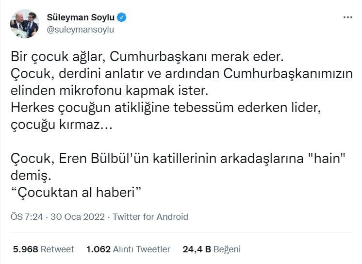 Olayın nasıl geliştiğini "Bir çocuk ağlar, Cumhurbaşkanı merak eder. Çocuk, derdini anlatır ve ardından Cumhurbaşkanımızın elinden mikrofonu kapmak ister. Herkes çocuğun atikliğine tebessüm ederken lider, çocuğu kırmaz..." sözleriyle anlatan Bakan Soylu, şu ifadeleri kullandı:
