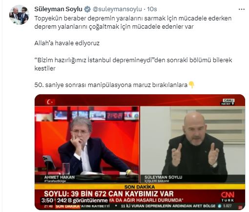 Süleyman Soylu, Twitter hesabından sözlerinin devamını da içeren video kaydını paylaşarak, "Topyekûn beraber depremin yaralarını sarmak için mücadele ederken deprem yalanlarını çoğaltmak için mücadele edenler var. Allah’a havale ediyoruz 'Bizim hazırlığımız İstanbul depremineydi'den sonraki bölümü bilerek kestiler 50. saniye sonrası manipülasyona maruz bırakılanlara" dedi.