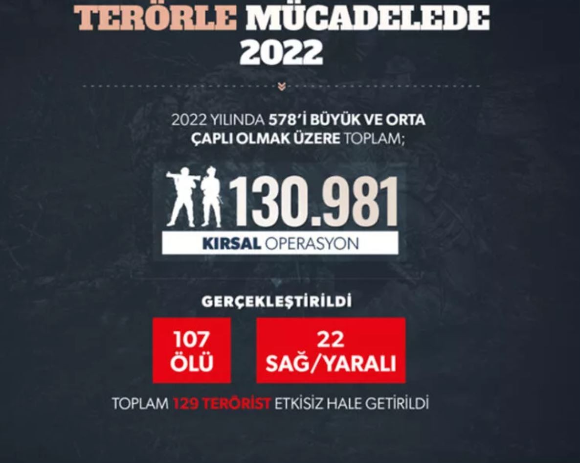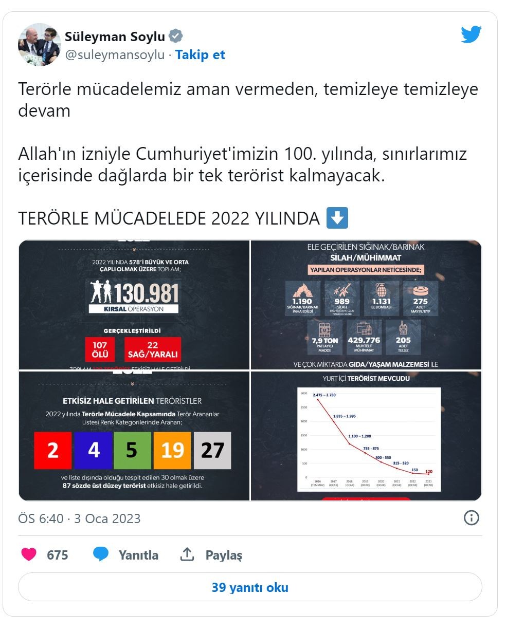 İçişleri Bakanı Soylu, Twitter hesabından yaptığı açıklamayla terörle mücadelede 2022 yılının verilerini paylaştı. Bakan Soylu, “Terörle mücadelemiz aman vermeden, temizleye temizleye devam. Allah'ın izniyle Cumhuriyet'imizin 100. yılında, sınırlarımız içerisinde dağlarda bir tek terörist kalmayacak. Terörle mücadelede 2022 yılında” ifadelerine yer verdi.