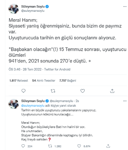 Meral Hanım; Siyaseti yanlış öğrenmişsiniz, bunda bizim de payımız var. Uyuşturucuda tarihin en güçlü sonuçlarını alıyoruz. "Başbakan olacağın"(!) 15 Temmuz sonrası, uyuşturucu ölümleri 941'den, 2021 sonunda 270’e düştü.