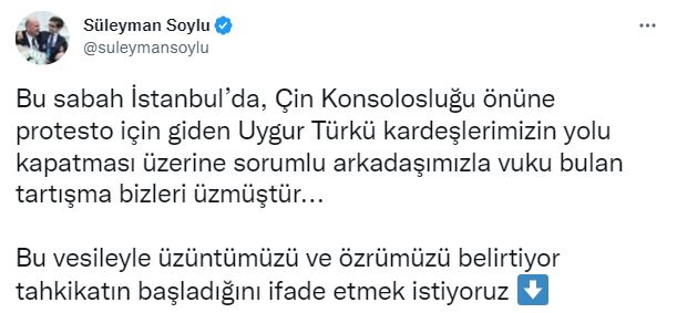 Soylu, açıklamasında, "Bugün sabah saatlerinde İstanbul'da, Çin Konsolosluğu önüne protesto için giden Uygur Türkü kardeşlerimizin yolu kapatması üzerine, bölgenin güvenliğini sağlamakla sorumlu arkadaşımızla vuku bulan tartışma bizleri üzmüştür" ifadesini kullandı.
