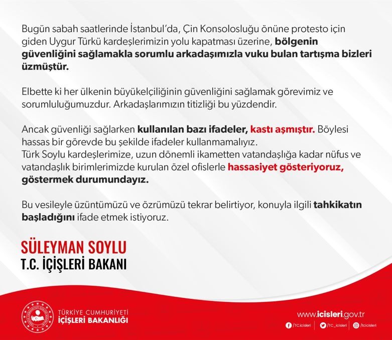İçişleri Bakanı Süleyman Soylu, "Çin Konsolosluğu önüne protesto için giden Uygur Türkü kardeşlerimizin yolu kapatması üzerine, bölgenin güvenliğini sağlamakla sorumlu arkadaşımızla vuku bulan tartışma bizleri üzmüştür" ifadesini kullandı.