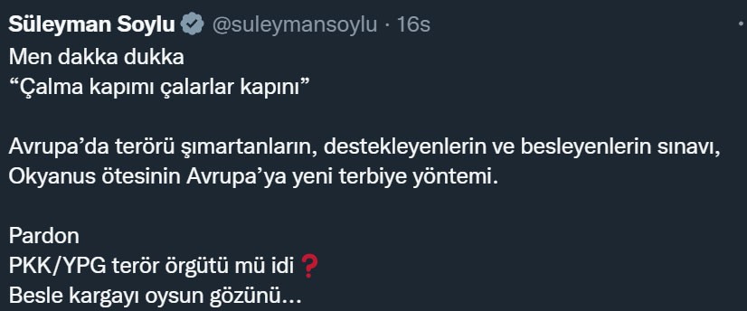 "Men dakka dukka “Çalma kapımı çalarlar kapını” Avrupa’da terörü şımartanların, destekleyenlerin ve besleyenlerin sınavı, Okyanus ötesinin Avrupa’ya yeni terbiye yöntemi. Pardon PKK/YPG terör örgütü mü idi? Besle kargayı oysun gözünü..."