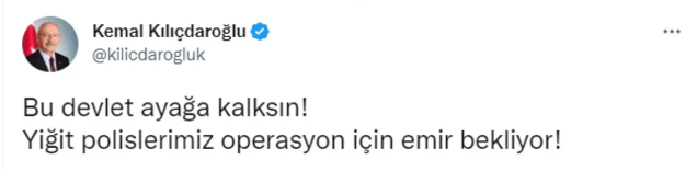 Olayı sosyal medya hesabına da taşıyan Kılıçdaroğlu, peş peşe paylaşımlarda bulundu. Cinsel taciz olayıyla ilgili "Bu devlet ayağa kalksın" diyen Kılıçdaroğlu, "Yiğit polislerimiz operasyon için emir bekliyor" notunu düştü.