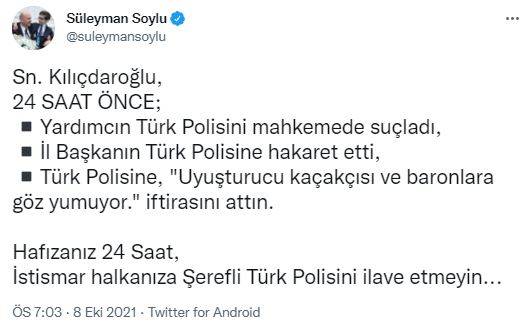 Paylaşımında, "24 saat önce, yardımcın Türk Polisi'ni mahkemede suçladı, il başkanın Türk Polisine hakaret etti" ifadelerini kullanan Soylu, Kılıçdaroğlu'nun da Türk Polisini 'uyuşturucu kaçakçısı ve baronlara göz yumuyor' iftirasını attığını vurguladı.