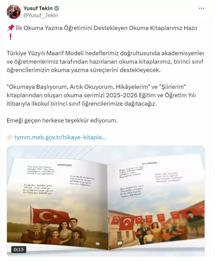 Bakan Tekin, sosyal medya hesabından yaptığı açıklamada, "İlk okuma yazma öğretimini destekleyen okuma kitaplarımız hazır. Türkiye Yüzyılı Maarif Modeli hedeflerimiz doğrultusunda akademisyenler ve öğretmenlerimiz tarafından hazırlanan okuma kitaplarımız, birinci sınıf öğrencilerimizin okuma yazma süreçlerini destekleyecek. 'Okumaya Başlıyorum, Artık Okuyorum, Hikayelerim' ve 'Şiirlerim' kitaplarından oluşan okuma serimizi 2025-2026 eğitim ve öğretim yılı itibarıyla ilkokul birinci sınıf öğrencilerimize dağıtacağız. Emeği geçen herkese teşekkür ediyorum" ifadelerini kullandı.