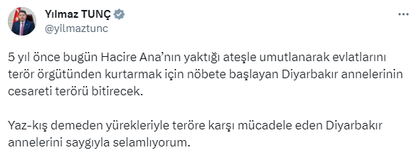 Bakan Tunç, "Evlatlarını terör örgütünden kurtarmak için nöbete başlayan Diyarbakır annelerinin cesareti terörü bitirecek" dedi.