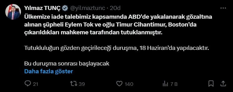 Adalet Bakanı Yılmaz Tunç sosyal medyadan yaptığı açıklamada "Ülkemize iade talebimiz kapsamında ABD'de yakalanarak gözaltına alınan şüpheli Eylem Tok ve oğlu Timur Cihantimur, Boston’da çıkarıldıkları mahkeme tarafından tutuklanmıştır. Tutukluluğun gözden geçirileceği duruşma, 18 Haziran’da yapılacaktır." ifadelerini kullandı.