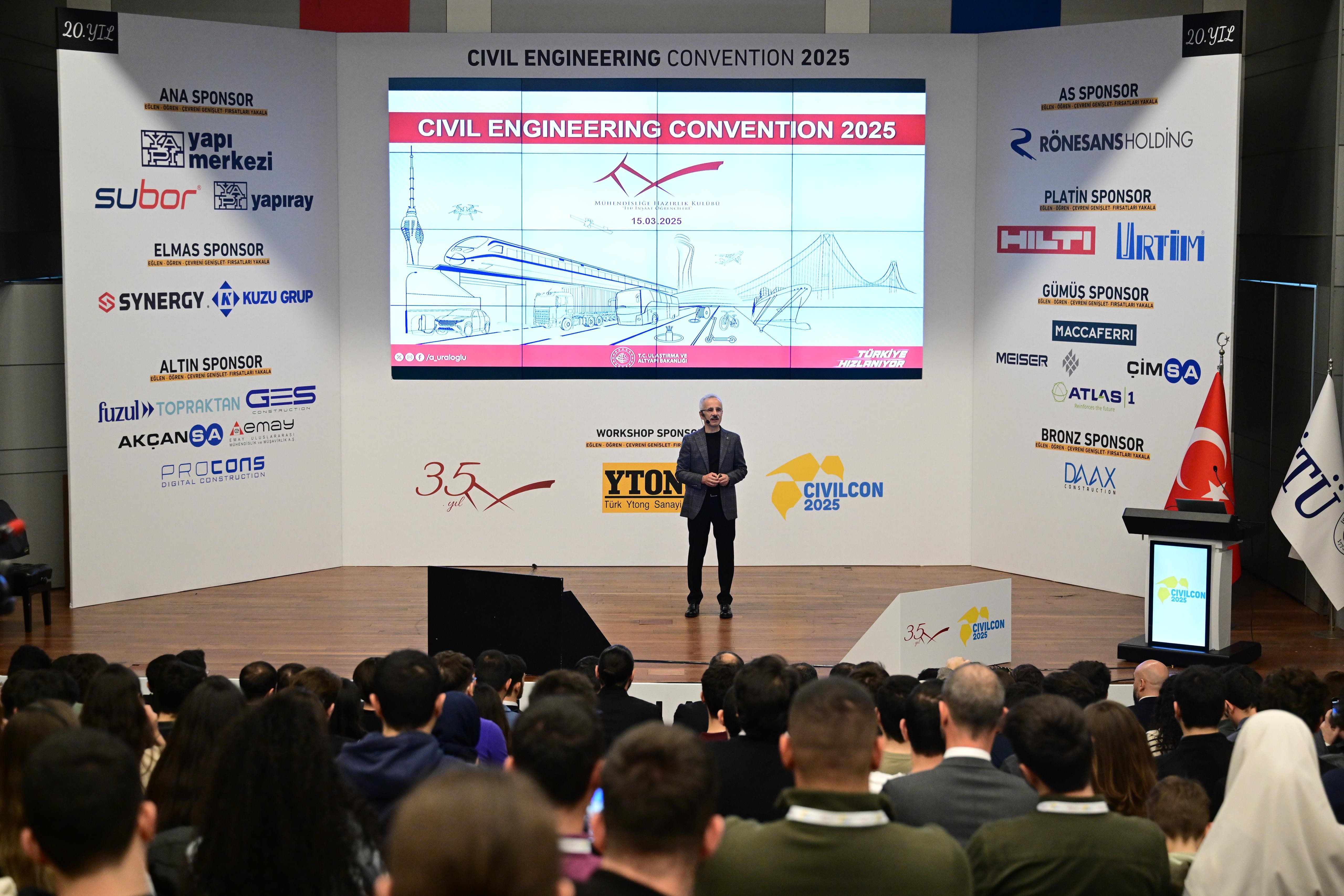 Ulaştırma ve Altyapı Bakanı Abdulkadir Uraloğlu, İstanbul Teknik Üniversitesi’nde (İTÜ) ‘Türkiye'nin Ulaşım Vizyonu’ seminerinde sunum yaptı. 15 Mart Cumartesi günü gerçekleşen etkinlik, İTÜ Süleyman Demirel Kültür Merkezi’nde düzenlendi.