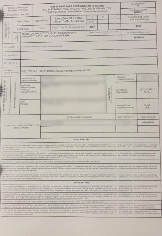 Ulaştırma ve Altyapı Abdulkadir Uraloğlu'na, Ankara-Niğde Otoyolu'nda aşırı süratten radar cezası kesildi.