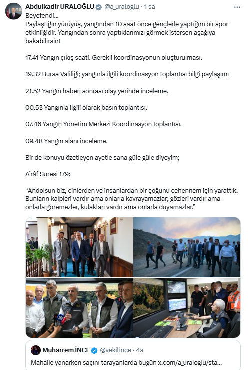 Bursa programı kapsamında kentte olan Ulaştırma ve Altyapı Bakanı Abdulkadir Uraloğlu’nu yürüyüş etkinliğinin tarihine bakmadan sosyal medya hesabından, “Mahalle yanarken, saçını tarayanlarda bugün” diyerek ahlaksızca hedef alan Muharrem İnce, rezil oldu.