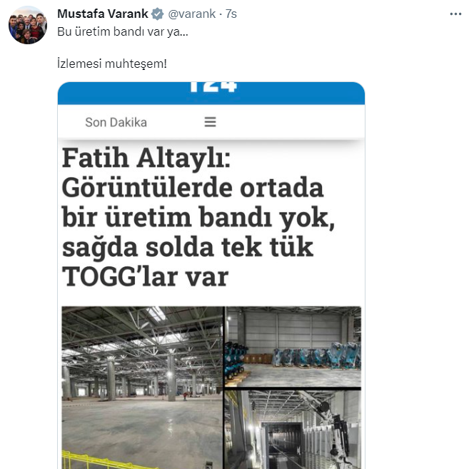 Altaylı TOGG'u hedef aldığı yazısında, paylaştığı fotoğraf karelerine, "Görüntülerde ortada bir üretim bandı yok. Sağda solda tek tük TOGG'lar var." mesajını yazmıştı.