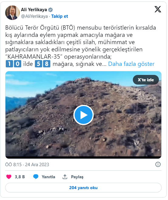 Paylaşımında operasyonların Kürtün, Dörtyol, Belen, Payas, Baykan, Şırnak-Merkez, Gabar, Silopi, Çukurca, Dicle, Ovacık, Bestler-Dereler, Silvan, Ergani, Elbistan, Savur, Betüşşebap ve Gercüş kırsalında düzenlendiğini belirten Yerlikaya, “15 kg patlayıcı madde, 20 kg amonyum nitrat, 58 adet fünye, ‘Patlayıcı maddelere yerleştirmek üzere’ 10 adet M-16 piyade tüfeği, 2 adet AK-47 piyade tüfeği, 2 adet mavzer tüfeği, 1 adet 105 mm obüs mühimmatı, 1 adet 120 mm top mühimmatı, 15 adet rpg-7 roketatar mühimmatı, 13 adet anti-tank mühimmatı, 19 adet EYP ’El Yapımı Patlayıcı’, 10 adet el bombası, 168 adet pil, 1568 adet çeşitli cinste ve ebatta mühimmat, ele geçirildi” dedi.