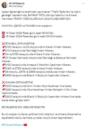 Yerlikaya, sosyal medya hesabından yaptığı açıklamada, bakanlık tarafından yayımlanan "trafik tedbirlerine ilişkin genelge" kapsamında, bayram tatili dönüşü İstanbul ve Ankara'da trafik yoğunluğunun azaltılabilmesi için kamyon, çekici ve tanker cinsi araçların 14 Nisan Pazar saat 05.00'ten, 15 Nisan Pazartesi saat 05.00'e kadar, seyirlerine izin verilmeyeceğini bildirdi.
