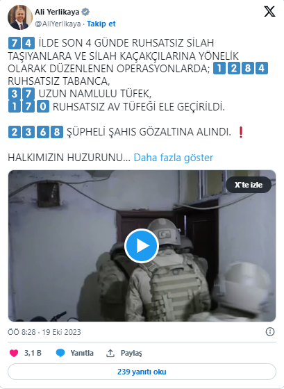 Bakan Yerlikaya, sosyal medya hesabından 'silah kaçakçılığı' ve 'ruhsatsız silah taşıma' suçlarının önlenmesine yönelik çalışma yapıldığını duyurdu. Buna göre; İl Jandarma Komutanlıkları ve İl Emniyet Müdürlükleri tarafından son 4 günde İstanbul, Ankara ve İzmir'in de aralarında bulunduğu 74 ilde ruhsatsız silah taşıyanlara ve silah kaçakçılarına yönelik operasyon düzenlendi. 2 bin 368 şüpheli gözaltına alınırken yapılan aramalarda 1284 ruhsatsız tabanca, 37 uzun namlulu tüfek, 170 ruhsatsız av tüfeği ele geçirildi. Operasyonları düzenleyen jandarma ve polisleri tebrik eden Yerlikaya, "Aziz milletimiz müsterih olsun; ruhsatsız silah temin edenlerle ve silah kaçakçılarıyla da mücadelemiz kararlılıkla sürecek" dedi.
