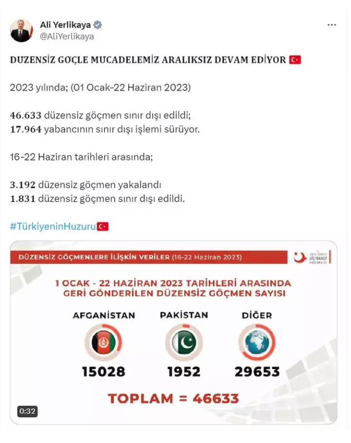 Bakan Yerlikaya, Twitter hesabından yaptığı açıklamada, "Düzensiz göçle mücadelemiz aralıksız devam ediyor. 2023 yılında (01 Ocak-22 Haziran 2023) 46 bin 633 düzensiz göçmen sınır dışı edildi; 17 bin 964 yabancının sınır dışı işlemleri sürüyor, 16-22 Haziran tarihleri arasında; 3 bin 192 düzensiz göçmen yakalandı, 1831 düzensiz göçmen sınır dışı edildi" dedi.