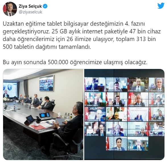 Milli Eğitim Bakanlığı tarafından (MEB) 500 bin tablet dağıtımı hakkında açıklama yapan Bakan Ziya Selçuk, ücretsiz olarak dağıtılan tablet sayısının toplamda 313 bin 500’e ulaştığını duyurdu ve konuyla ilgili olarak 4'üncü fazın başladığını bildirdi.