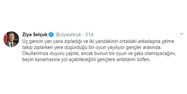 Bakan Selçuk, Twitter üzerinden yaptığı açıklamada, gençler arasında yayılan ve ciddi tehlikeler doğurabilecek harekete karşı uyardı.