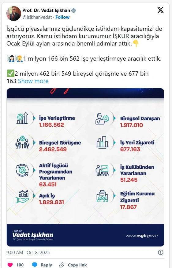 Çalışma ve Sosyal Güvenlik Bakanı Vedat Işıkhan, İŞKUR'un yılın ilk dokuz ayında istihdama yönelik çalışmalarını paylaştı. Bakan Işıkhan sosyal medya üzerinden yaptığı paylaşımda İŞKUR aracılığıyla Ocak-Eylül döneminde 1 milyon 166 bin 562 kişi işe yerleştirildiği bilgisini paylaştı.