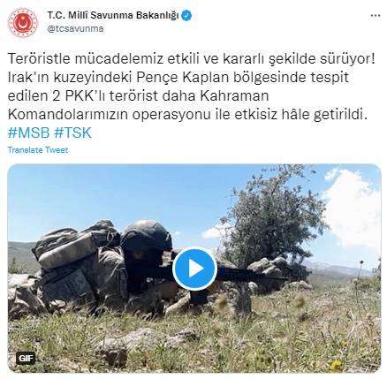 Açıklamada, Irak'ın kuzeyindeki Pençe Kaplan bölgesinde tespit edilen 2 PKK'lı teröristin daha komandoların operasyonuyla etkisiz hale getirildiği kaydedildi.