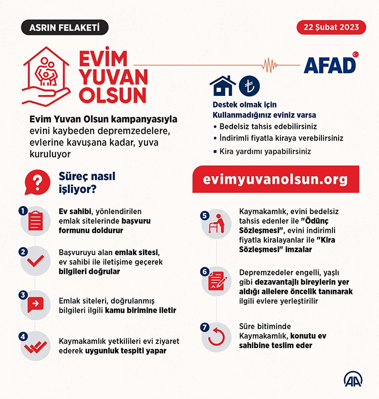 Kampanyanın yürütüldüğü "www.evimyuvanolsun.org" internet sitesinde "Evimi En Az 3 Ay Bedelsiz Tahsis Etmek İstiyorum" butonuna tıklayanların başvuruları, evin bulunduğu ilçenin kaymakamlığı tarafından yerinde incelenecek.