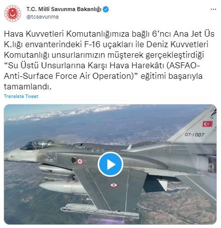 "Hava Kuvvetleri Komutanlığımıza bağlı 6’ncı Ana Jet Üs K.lığı envanterindeki F-16 uçakları ile Deniz Kuvvetleri Komutanlığı unsurlarımızın müşterek gerçekleştirdiği “Su Üstü Unsurlarına Karşı Hava Harekâtı (ASFAO-Anti-Surface Force Air Operation)” eğitimi başarıyla tamamlandı."